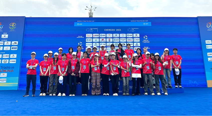 5月10日至11日,2025成都·金堂铁人三项世界杯在成都市金堂县盛大举行。作为世界铁人三项联盟(World Triathlon)旗下的重要赛事,本次比赛吸引了来自40多个国家和地区的顶尖运动员参赛。在赛事筹备和举办期间,外国语学院55名学生在运动项目外语教研室主任、青年党员教师李梦楚和青年党员教师李雪老师的带领下,为赛事提供了专业高效的英语语言服务,保障了赛事的顺利运行。