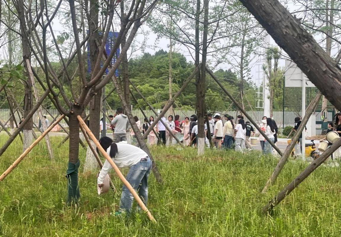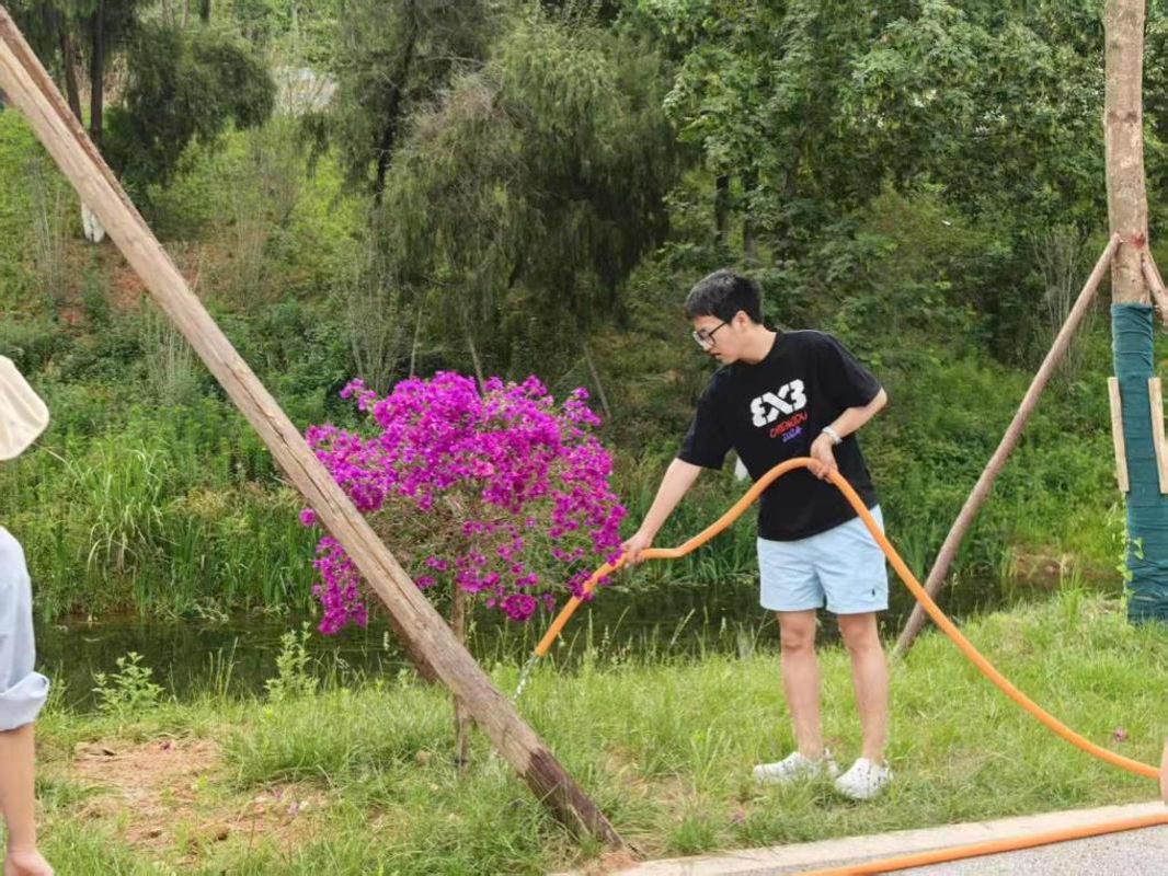 活动现场,学生们分组协作,分工明确,在湖岸边,同学们手持水桶、水管,前去灌溉草木,在另一旁的道路上,同学们手持垃圾袋,轻轻拾起草坪中的塑料瓶、纸屑等垃圾。当汗湿的后背映着清晨阳光,原本杂乱的绿化带重现干净整洁,劳动教育的深意已悄然扎根在沾满草屑的运动鞋与磨红的手掌纹路之间。