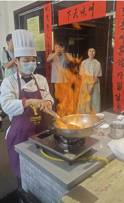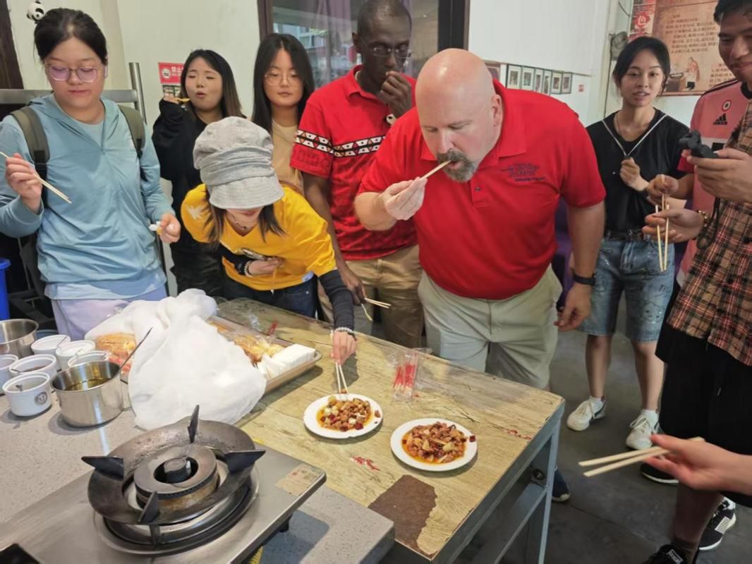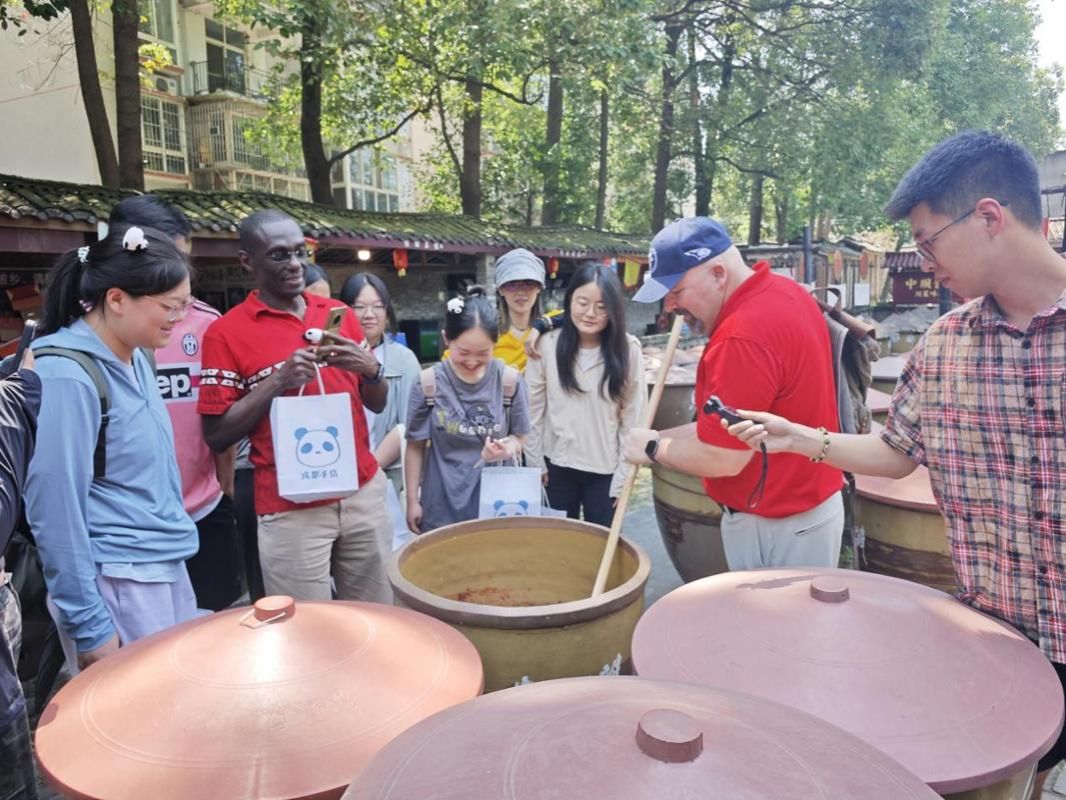 在工作人员的带领下,我院师生首先参观了博物馆中各类展现川菜文化的文物,如烹饪器具、餐具等,了解了川菜的起源和发展历程,形成的流派和味型,代表性菜品的演变和著名川菜大师的事迹。随后,师生来到国家级非物质文化遗产郫县豆瓣酱制作区,详细了解豆瓣酱从选材、制曲到发酵、晒制的制作技艺。外教还体验了翻搅酱料的过程,对这一非遗文化表现出极大的兴趣。最后,师生观看了川菜代表菜品“宫保鸡丁”的烹饪方法,并品尝了这一美食,外教也同工作人员和学生交流了自己家乡的饮食文化。在热烈的讨论和阵阵掌声中,活动圆满结束。