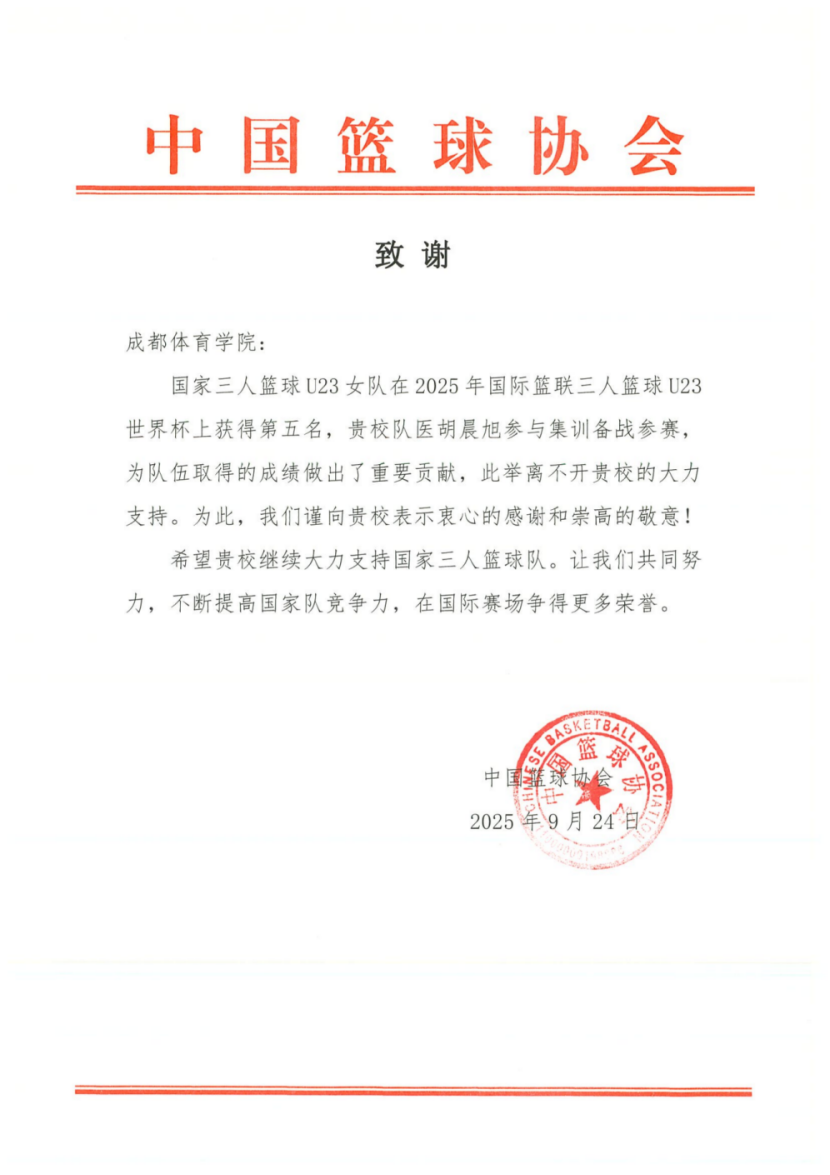 为备战2025年国际篮联三人篮球U23世界杯,红足1世运动康复研究生胡晨旭于8月9日进入国家U23三人女篮队伍,担任随队队医一职。在集训和比赛期间,为包括首发和替补在内的10名国家队运动员提供伤病防护与康复保障。在与教练组全体成员的积极配合协作下,本次中国U23女队力克各国强队,取得国际篮联国家联赛总分第二、国际篮联三人篮球U23世界杯总分第五的优异成绩。