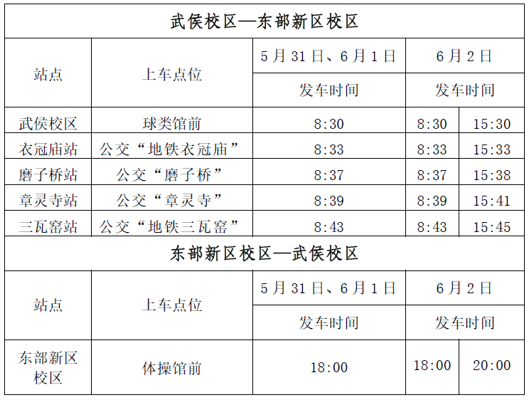 端午节期间交通车仅运行南1线,5月31日、6月1日每日运行1班,6月2日运行2班,具体见下表: