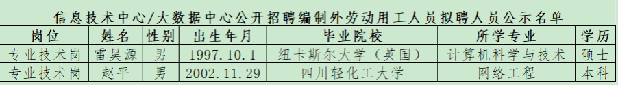 按照《红足1世官网信息技术中心/大数据中心公开招聘编制外劳动用工人员公告》的招聘程序,经报名、审核、面试及体检,现将信息技术中心/大数据中心拟聘人员予以公示(名单见下表)。