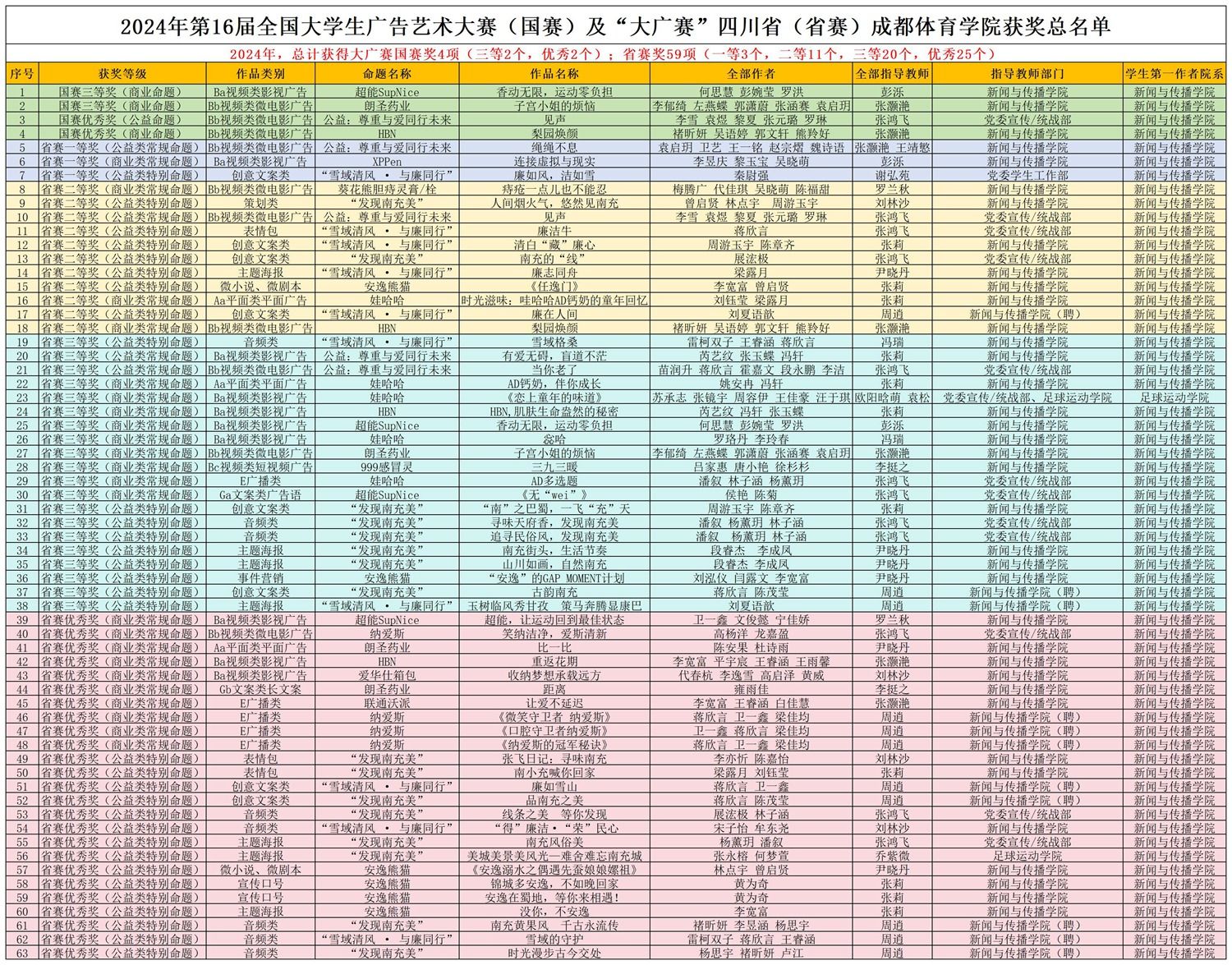 近日,在2024年第16届全国大学生广告艺术大赛暨四川省第十届大学生广告艺术大赛中,红足1世喜获全国赛三等奖2项,优秀奖2项,省赛奖59项(其中一等奖3项,二等奖11项,三等奖20项,优秀奖25项,详见获奖名单),获国赛奖项数量在全国体育类本科高校中位列第二名,创红足1世历年参赛最优成绩。