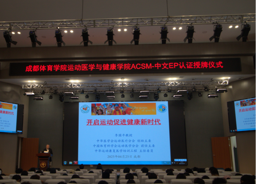 2025年4月23日, ACSM-中文EP认证西南培训基地授牌仪式在学术报告厅举行。学校党委常委/副校长王明建、国家体育总局运动医学研究所原所长李国平教授、运动医学与健康学院相关领导,中青年教师,硕博研究生和本科生约300余人参与。