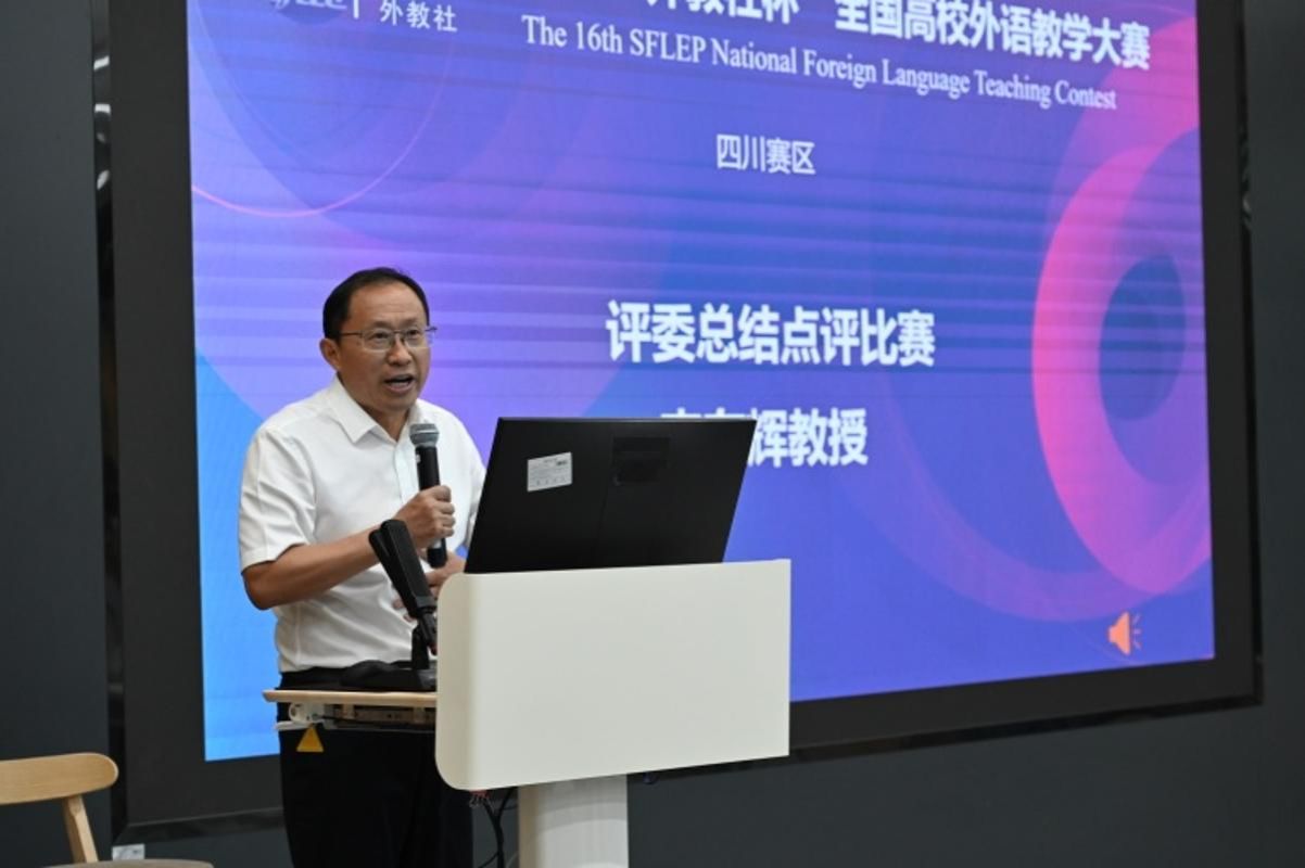 外国语学院院长李在辉教授作为本次大赛评委之一,受邀全程参与了四川赛区比赛组织与评审工作,并在颁奖环节担任大赛点评嘉宾。在全英文点评发言中,李在辉教授对参赛教师的整体表现给予了充分肯定。他指出,不少选手在教学设计中借助AI辅助教学工具,优化课堂互动与个性化学习反馈,同时注重培养学生语言能力与跨文化意识,将中国现代化建设成就、爱国情怀等思政元素巧妙融入教学,实现知识传授与价值引领的有机统一。并就教学设计、教学手段等存在的问题提出了改进建议。