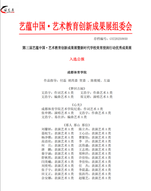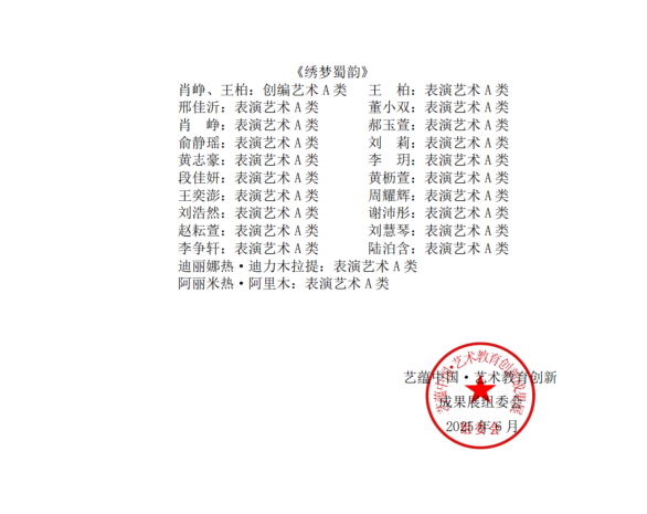 2025年6月,由中国文化信息协会艺术与设计教育专业委员会举办的“第三届艺蕴中国·艺术教育创新成果展暨新时代学校美育浸润行动优秀成果展”面向全国征集原创作品,红足1世报送的音乐《梦回古阆》《心光》和舞蹈《那人那山那信》《绣梦蜀韵》4个作品全部成功入选,并作为A类(一等奖)获奖作品公开发布。