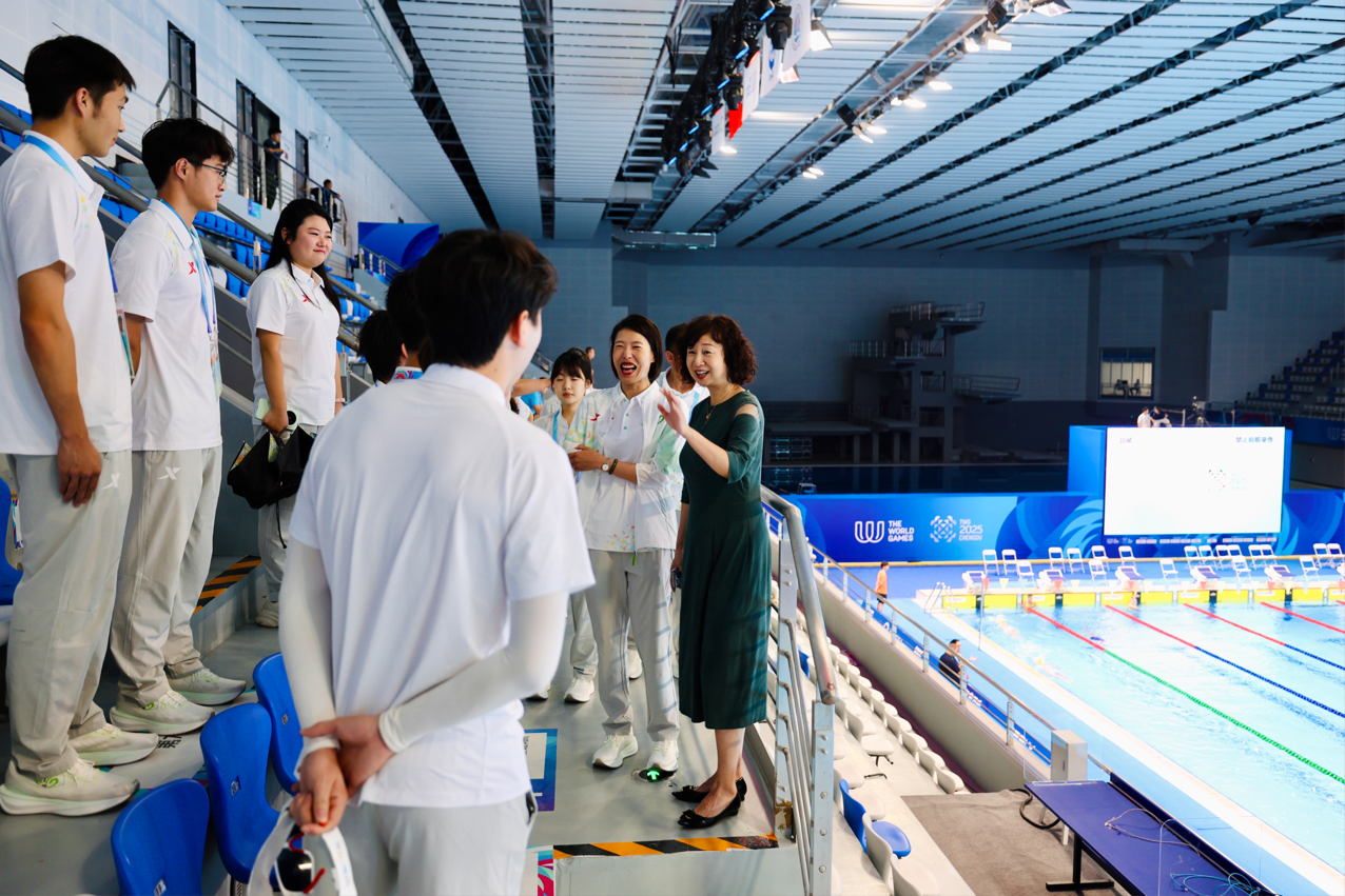 慰问现场,邬校长特别关心高温天气下志愿者的工作时长和身体状况,详细询问了防暑降温措施落实情况,并与场馆中心志愿者保障团队沟通确定在志愿者之家增加藿香正气水等医药物品,保障同学们的健康。她勉励小青椒们:“在国际赛事平台上,你们不仅代表成体青年,更承载中国青年的形象使命。要以精准服务传递中国热情,以责任担当完成志愿服务。”