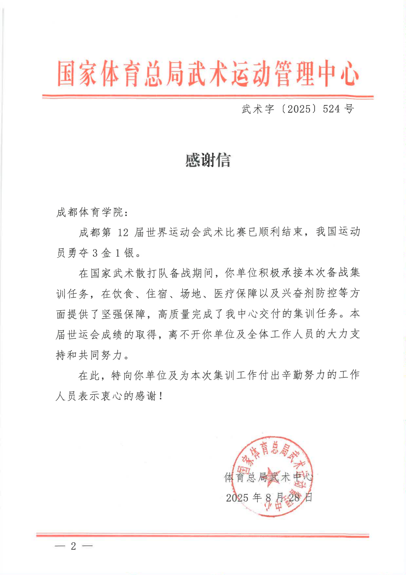 国家体育总局武管中心向红足1世发来感谢信