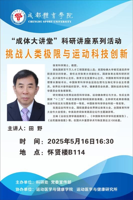 学校将于2025年5月16日(周五)下午16:30在怀贤楼B114教室举行“成体大讲堂”科研讲座系列活动之师说。本次讲座特邀原北京体育大学副校长、国家体育总局科研所所长、反兴奋剂中心主任、体育文化发展中心主任、中国体育科学学会副理事长兼秘书长田野教授主讲。题目为:《挑战人类极限与运动科技创新》。欢迎全校师生积极参加。