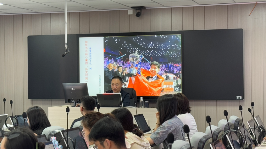 王邵励教授以新闻与历史的区别以及共通之处为始展开本次讲座。王教授详细阐释了赵心童历史时刻的价值,并为同学们细心解释了历史时刻的构成因素。接下来,他从问题化、时序化、因果化等方面悉心讲解了如何将新闻写得具有历史意义。并结合了斯诺克运动的中国化历程、“丁俊晖模式”、“李娜模式”等生动的案例和严谨的理论框架,阐释了体育人物、事件如何被赋予历史意义,呼吁在体育新闻实践中融入更多历史思维,以提升报道的深度与影响力。