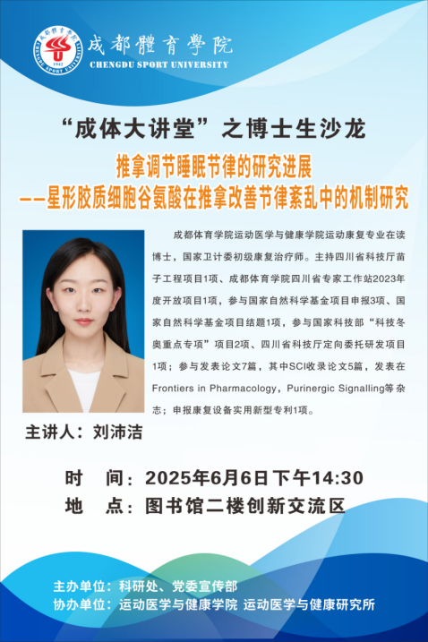 学校将于2025年6月6日(周五)下午14:30在图书馆二楼创新交流区举行“成体大讲堂”科研讲座系列活动之博士生沙龙。本次讲座特邀运动医学与健康学院运动康复专业在读博士刘沛洁主讲。题目为:《推拿调节睡眠节律的研究进展——星形胶质细胞谷氨酸在推拿改善节律紊乱中的机制研究》。欢迎全校师生积极参加。