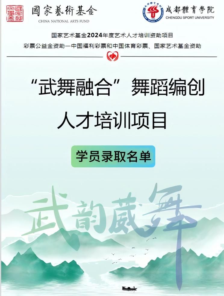 根据《国家艺术基金项目资助管理办法》《国家艺术基金资助项目监督管理办法》等有关规定,以及“武舞融合”舞蹈编创人才培养项目学员遴选标准,按照“公开、公平、公正、透明”的原则,经“武舞融合”舞蹈编创人才培养项目组评审,并报国家艺术基金管理中心批准,现将国家艺术基金2024年度“武舞融合”舞蹈编创人才培养项目录取名单予以公布(排名不分先后):