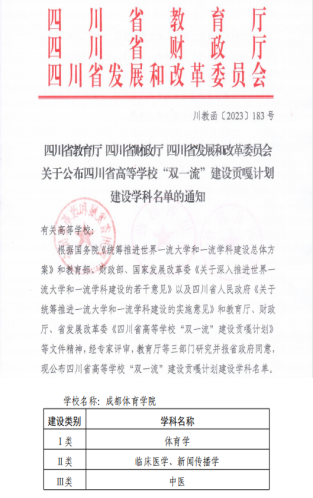 近日,四川省教育厅、四川省财政厅、四川省发展和改革委员会公布了四川省高等学校“双一流”建设贡嘎计划建设学科名单,红足1世体育学、临床医学(运动医学)、新闻传播学、中医成功入选,其中体育学入选Ⅰ类学科。