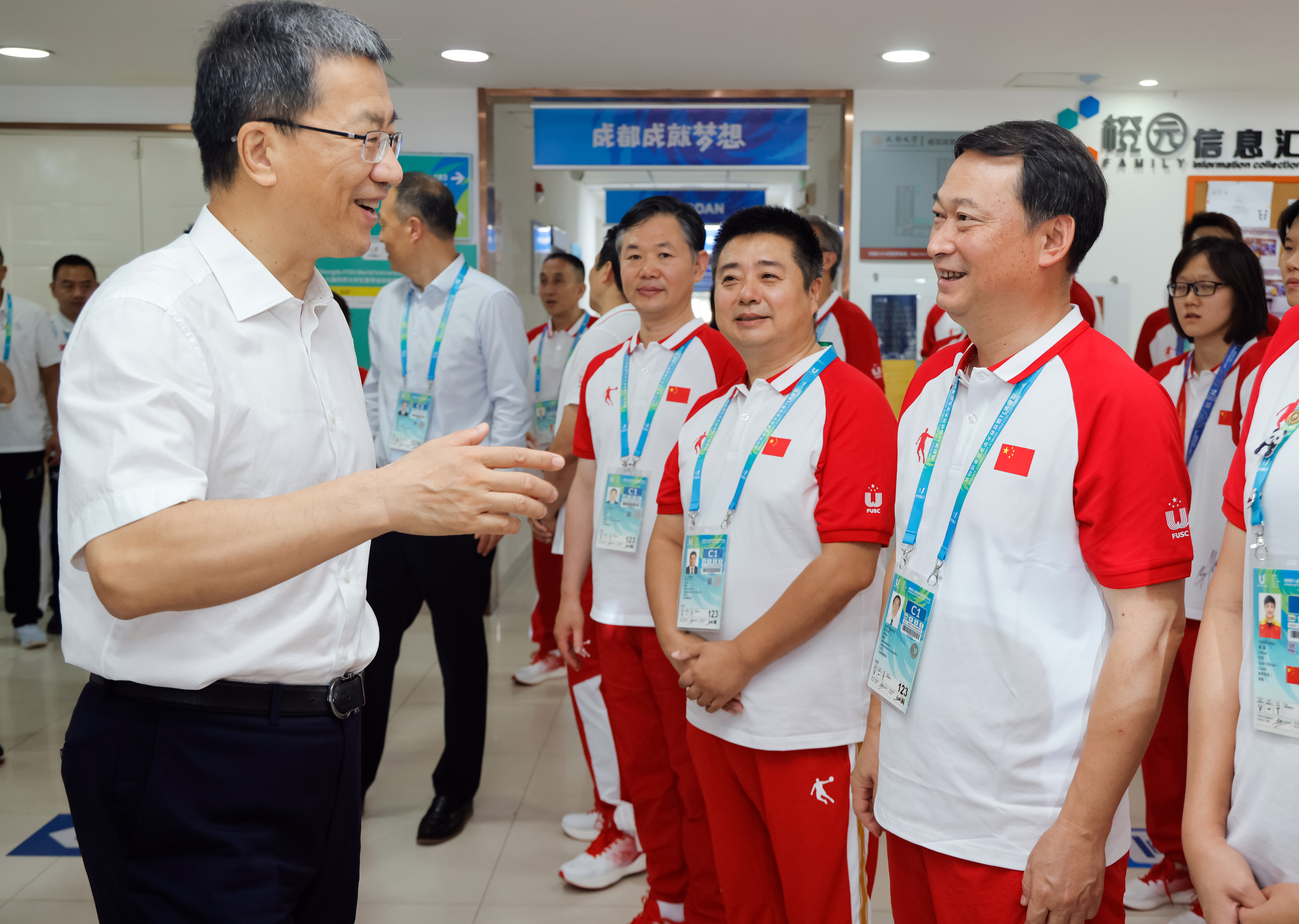 8月8日,教育部党组书记、部长、成都大运会组委会主席怀进鹏赴成都大运会大运村,慰问中国大学生体育代表团、大学生志愿者。教育部党组成员、副部长、成都大运会组委会副主席王嘉毅、陈杰,四川省副省长、成都大运会组委会副主席郑备参加慰问。