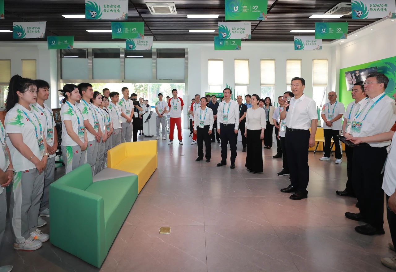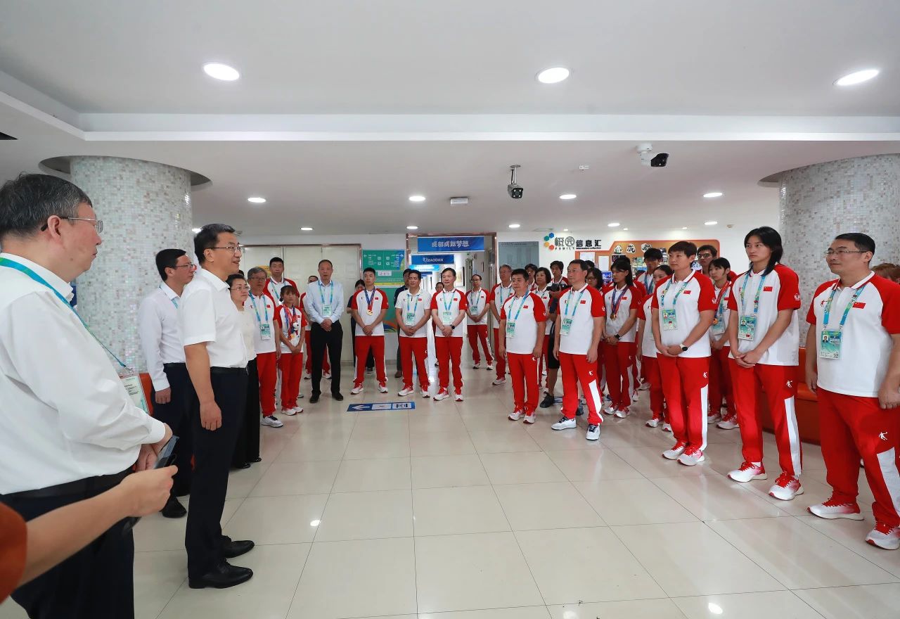怀进鹏首先来到中国大学生体育代表团驻地,亲切看望运动员代表和代表团成员,并代表教育部、成都大运会组委会对中国大学生体育代表团在本次大运会上取得的优异成绩表示热烈的祝贺。他指出,成都大运会是党的二十大后我国举办的首个大型综合性体育赛事,也是我国疫情防控转入“乙类乙管”后的首场重大国际赛事,是青春的盛会、团结的盛会、友谊的盛会。中国大学生体育代表团在大运赛场上顽强拼搏,体现了中国青年一代奋勇争先、团结向上的精神风貌,在大运赛场外热情好客,弘扬中华文化,彰显中国形象,让世界看到了一个精彩的中国、友谊的中国、朝气的中国,赢得了各界广泛赞誉。希望大家再接再厉,在竞技场和人生的赛场上取得更大的成绩。