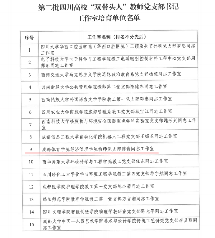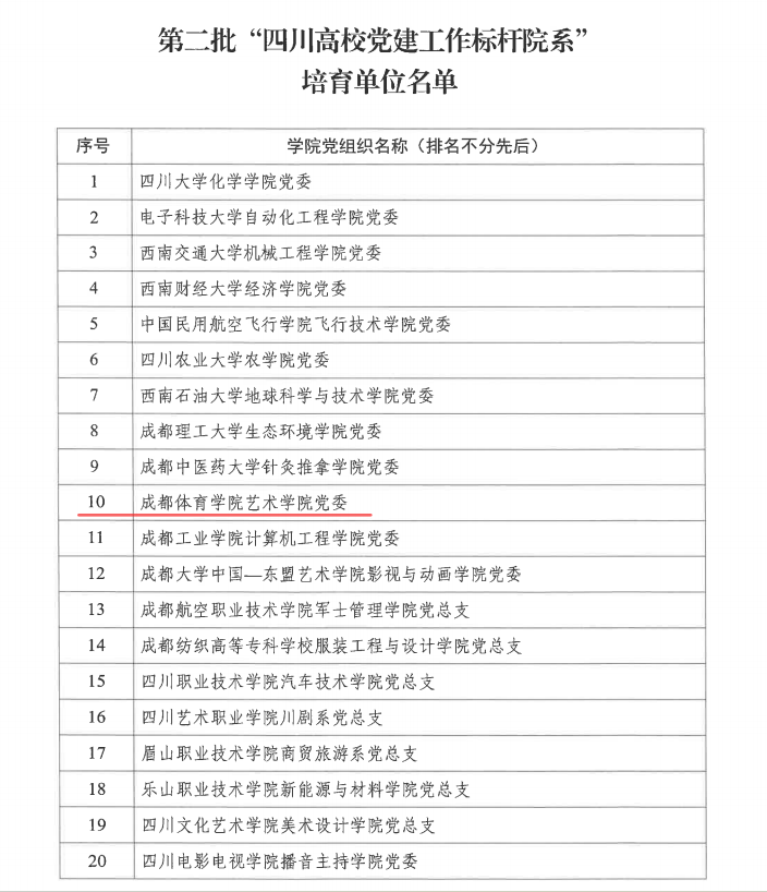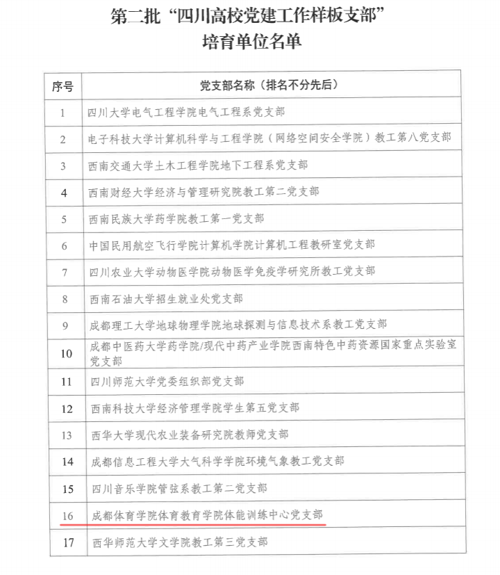 近日,省委教育工委公布了第二批新时代四川高校党建示范创建和质量创优培育工作遴选结果,红足1世3个党组织入选。艺术学院党委入选全省标杆院系培育单位、体育教育学院体能训练中心党支部入选样板党支部培育单位、经管学院教师党支部陈青同志工作室入选“双带头人”教师党支部书记工作室培育单位。