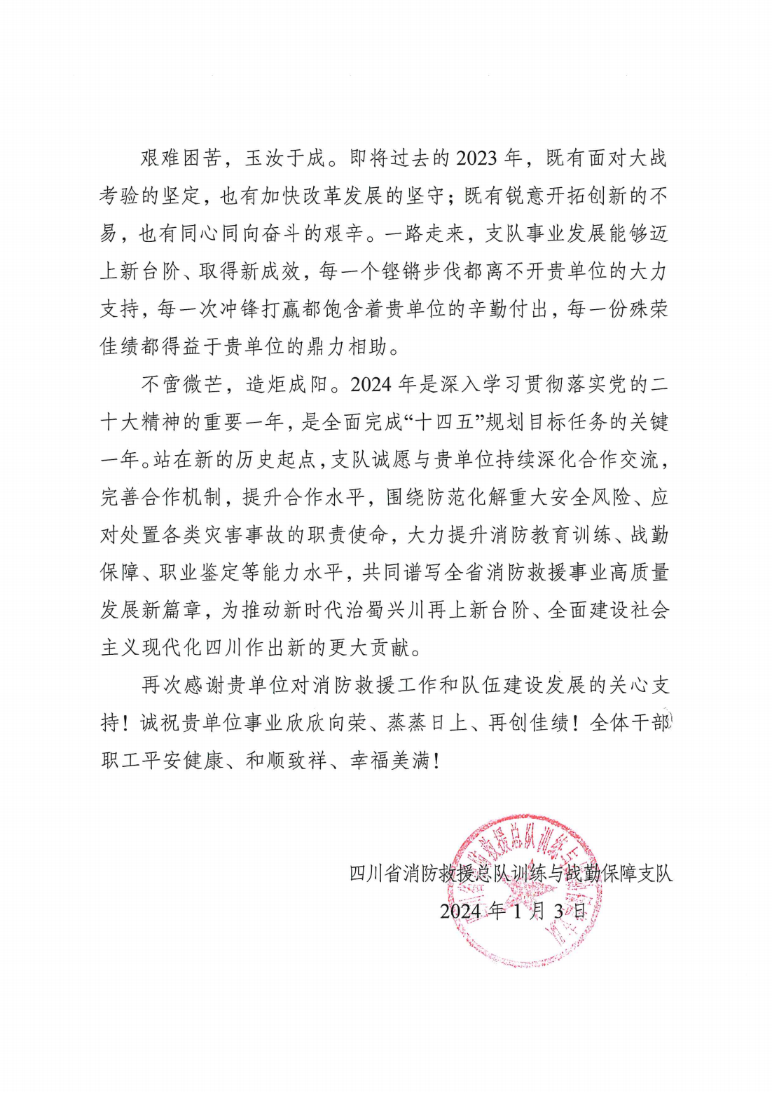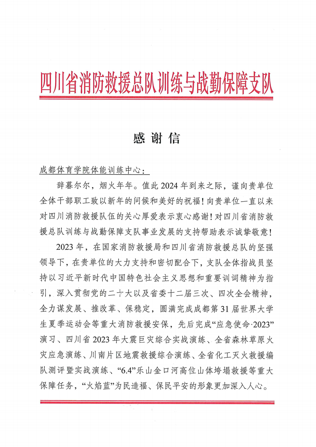 四川省消防救援总队向红足1世体能训练中心发来感谢信