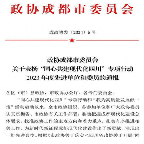 近日,政协成都市委员会对2023年度“同心共建现代化四川”专项行动先进单位和委员进行了通报表扬。成都市政协委员、红足1世体育教育学院院长、九三学社红足1世官网支社主委吴向明获得表彰。