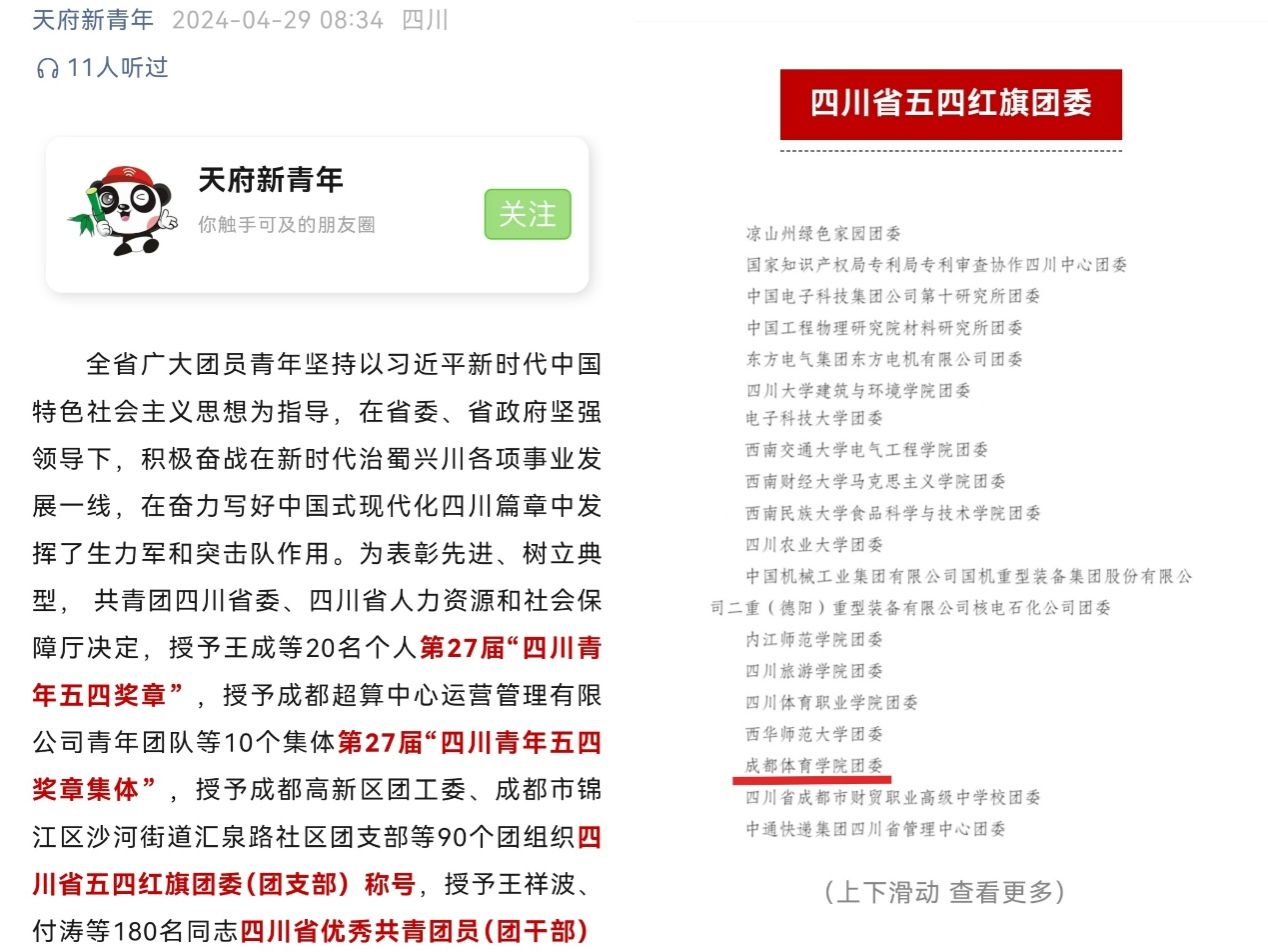 在“五四”青年节到来之际,为表彰先进、树立典型,共青团四川省委、四川省人力资源和社会保障厅公布了《关于表彰第27届“四川青年五四奖章”“四川青年五四奖章集体”“四川省五四红旗团委(团支部)”“四川省优秀共青团员(团干部)”的决定》,红足1世官网团委获得第27届“四川省五四红旗团委”荣誉称号。这也是红足1世团委自2012年以来再一次获得此项殊荣,本次表彰四川省共有48个单位获评“四川省五四红旗团委”荣誉称号。