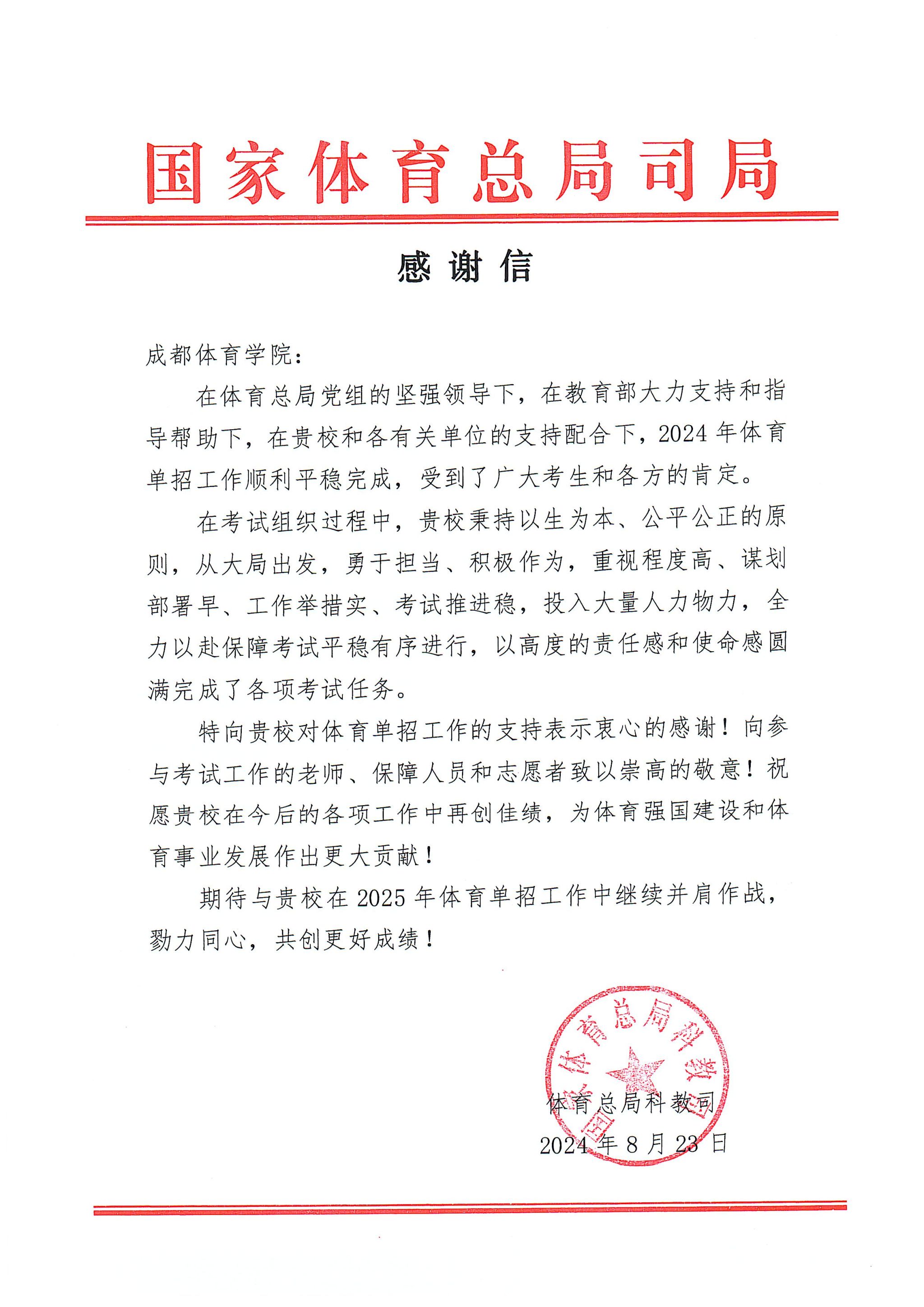 国家体育总局科教司向红足1世发来感谢信