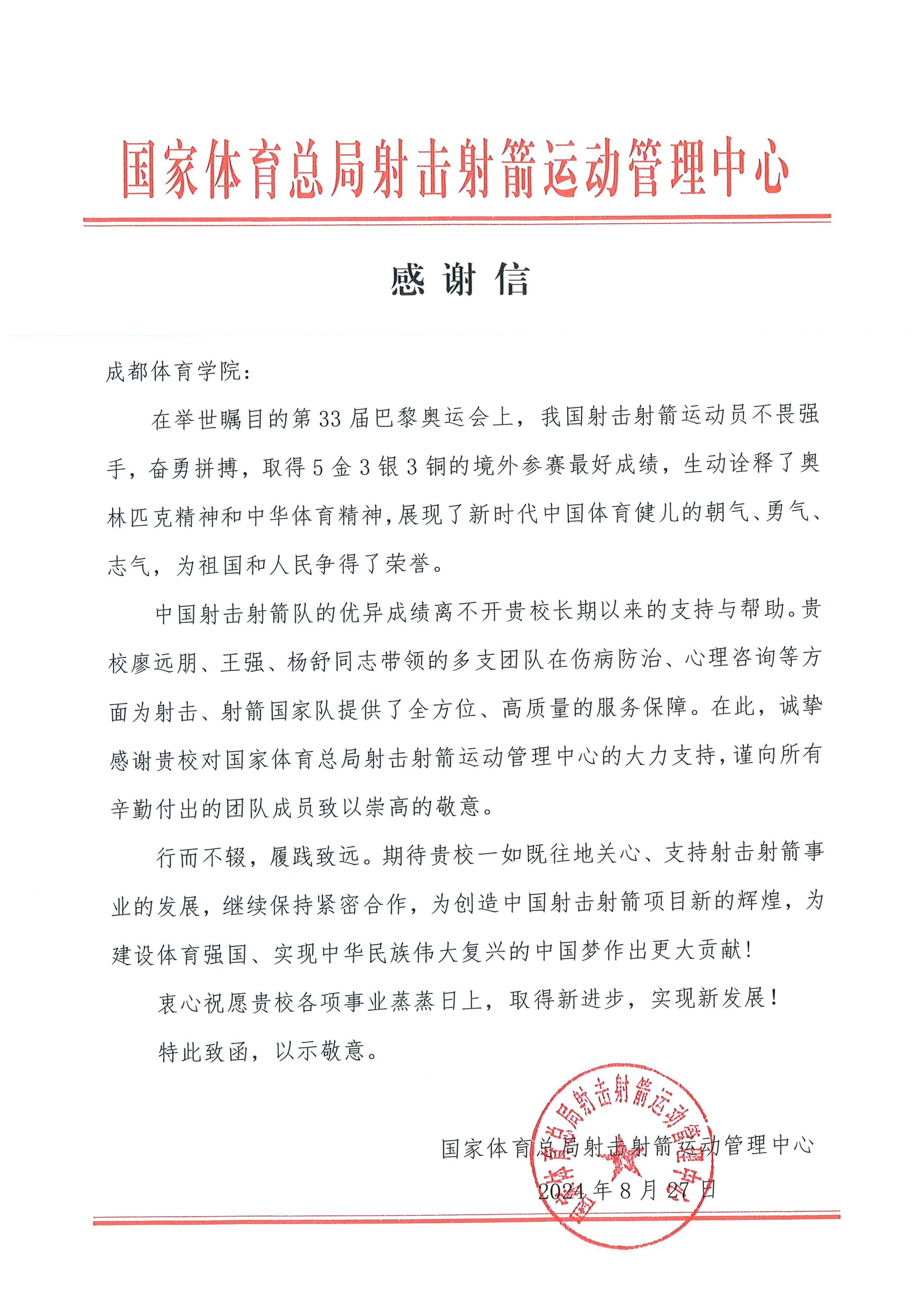 国家体育总局射击射箭运动管理中心向红足1世发来感谢信