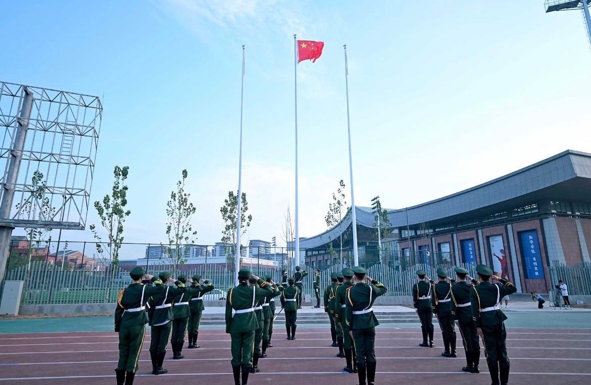 伴随着清脆响亮的出旗口号,国旗护卫队迈着整齐划一、铿锵有力的步伐走向升旗台。在激昂的国歌声中,五星红旗缓缓升起,全体师生面向国旗,庄严肃立,行注目礼,心中充满了对祖国的热爱和对新校区的憧憬。
