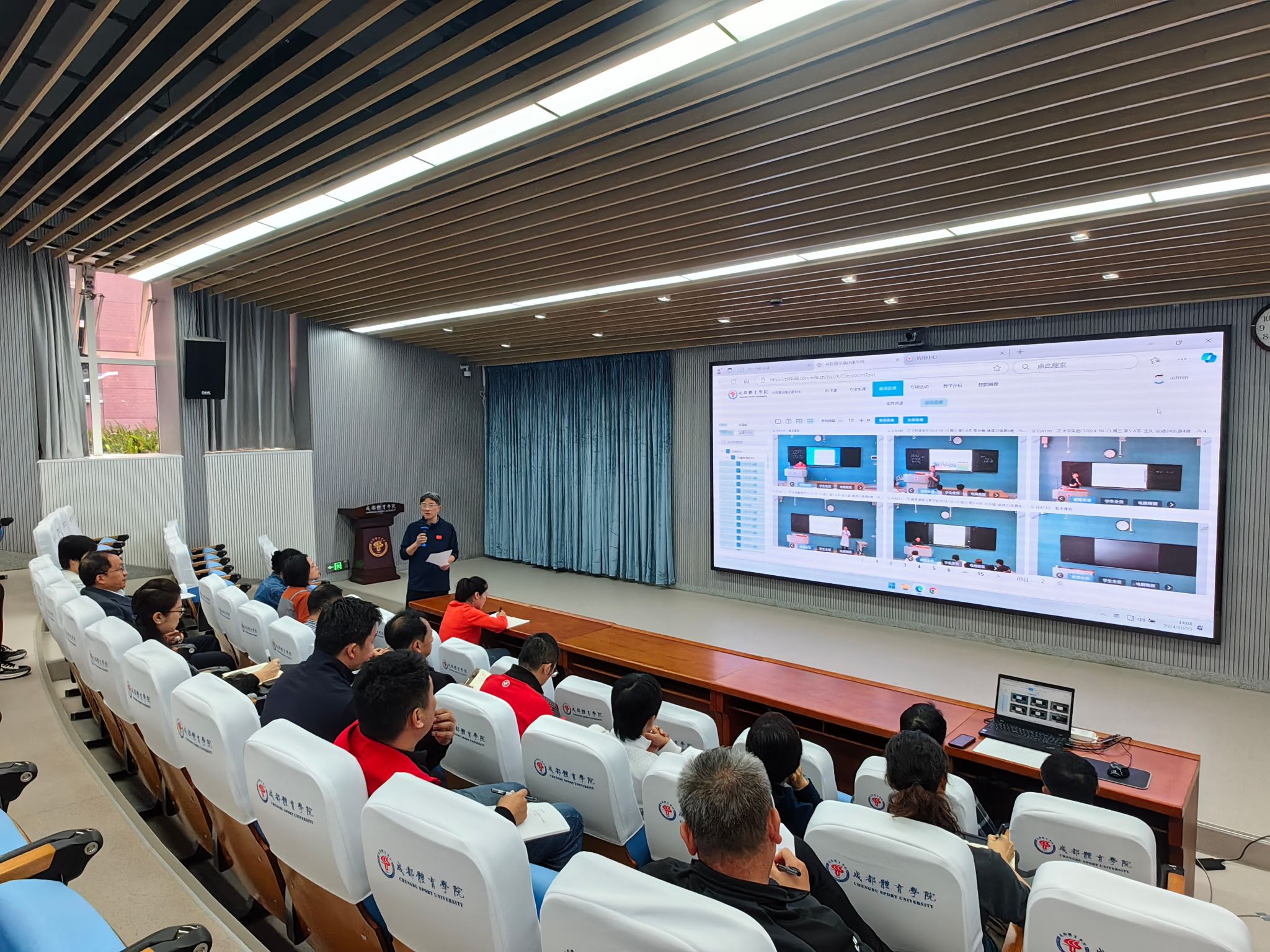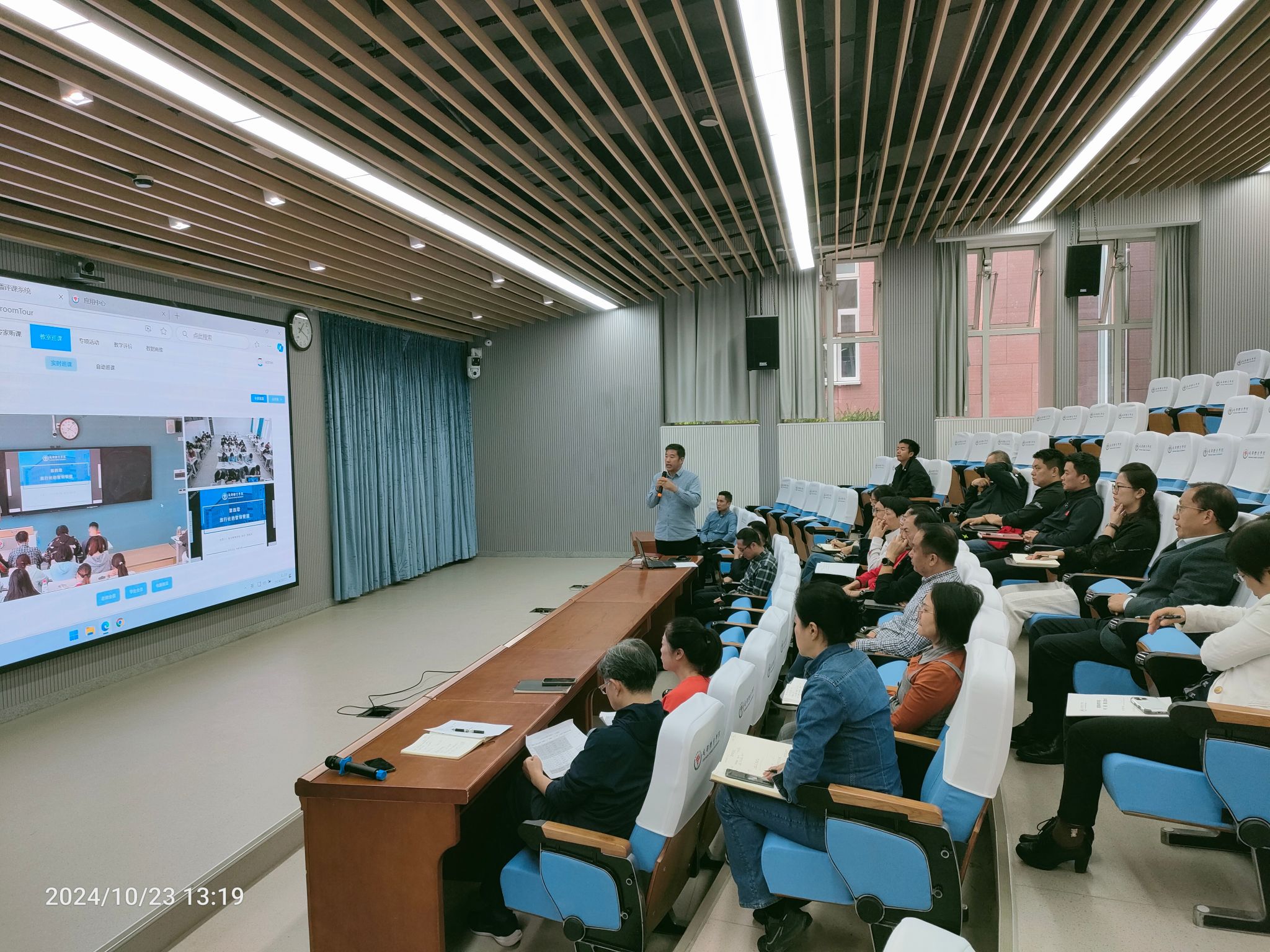 10月23日下午13:10——第一节课课前10分钟,学校党委常委、副校长李林带领各二级学院、学生处、信息技术中心、图书馆、教学质量评估中心、教务处/实验管理处等单位负责人以及学校教学督导组组长,20余人齐聚行健楼教学运行监控中心,开展了全校课堂教学线上集中巡课活动。