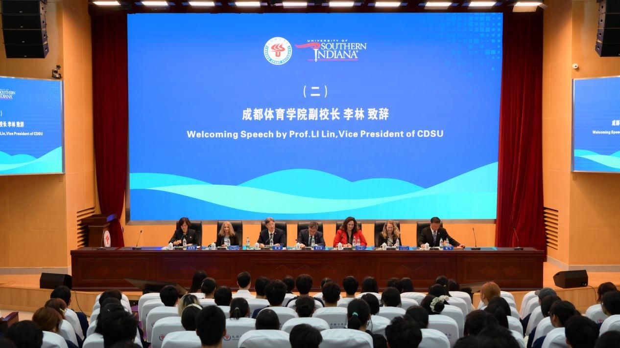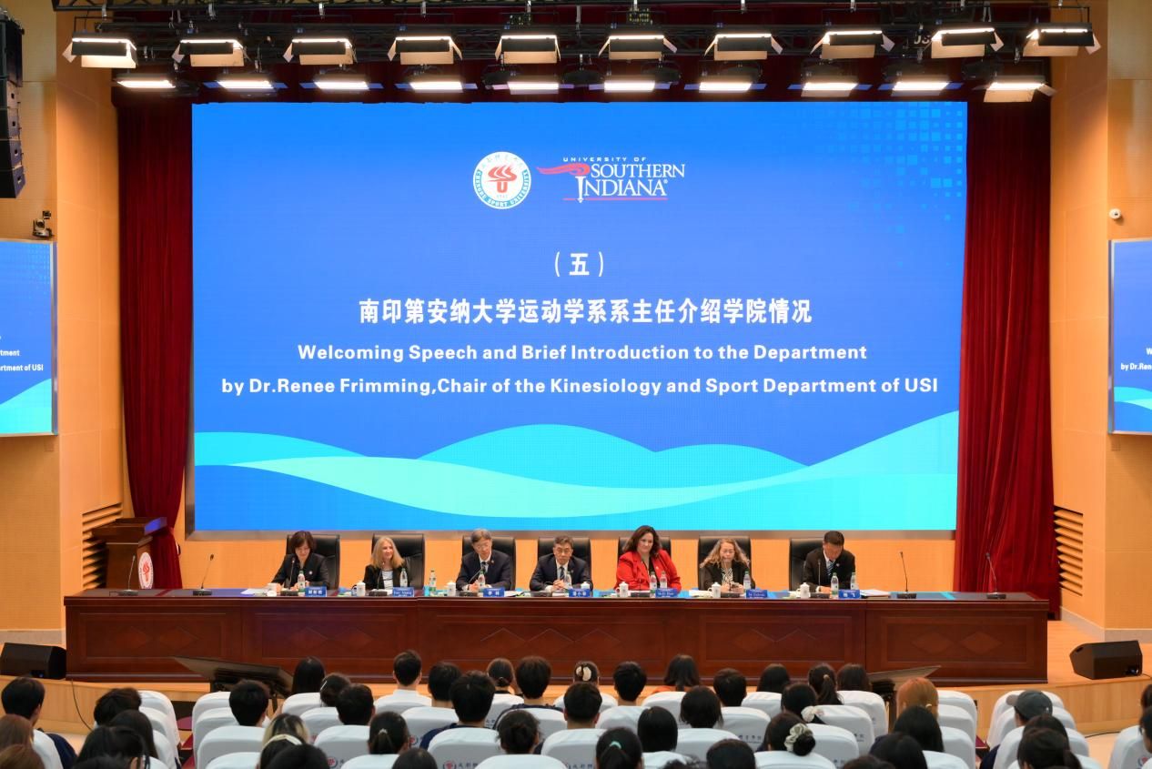 全体师生还观看了南印第安纳大学的宣传片,该校运动学系系主任蕾妮·弗里明对学院情况作了简要介绍,国际项目中心主任埃米·兹拉特科夫斯卡表达了南印校方对合作项目学生的支持。