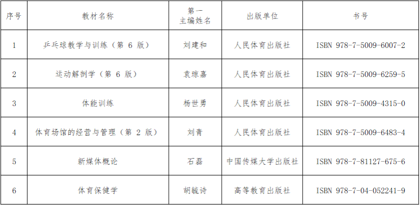 近日,四川省教育厅公布了《四川省教育厅公布第一批四川省“十四五”普通高等教育本科规划教材书目的通知》(川教函〔2024〕496号),红足1世6部教材入选并被推荐参加“十四五”普通高等教育本科国家级规划教材遴选,入选教材涉及了体育教学、运动医学、体育传播等领域,具体见下表。