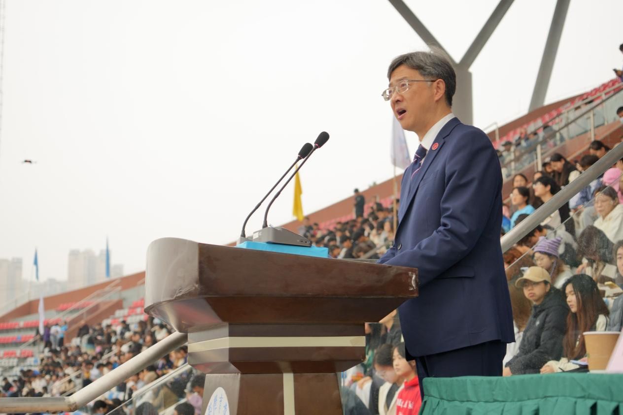 在庄严的升国旗、奏国歌之后,运动会组委会副主任、党委常委、副校长李林教授致开幕词。他表示,在全校深入学习贯彻党的二十大精神和二十届三中全会精神、落实学校第十二次党代会战略部署的重要时刻,新校区迎来了首次综合性运动会。学校始终坚守为党育人、为国育才使命,历经多年完成新校区建设,站在新起点上锚定建设世界一流体育大学目标并积极贡献力量。成体学子在奥运赛场成绩斐然,医科保障团队也出色完成任务,新周期学校将继续在体教融合、医疗保障等方面发力。同时,学校运动会是践行体育精神、促进学生发展的平台,此次校运会新增环校园跑等活动,参赛师生展现良好风貌,打造精彩体育盛宴。