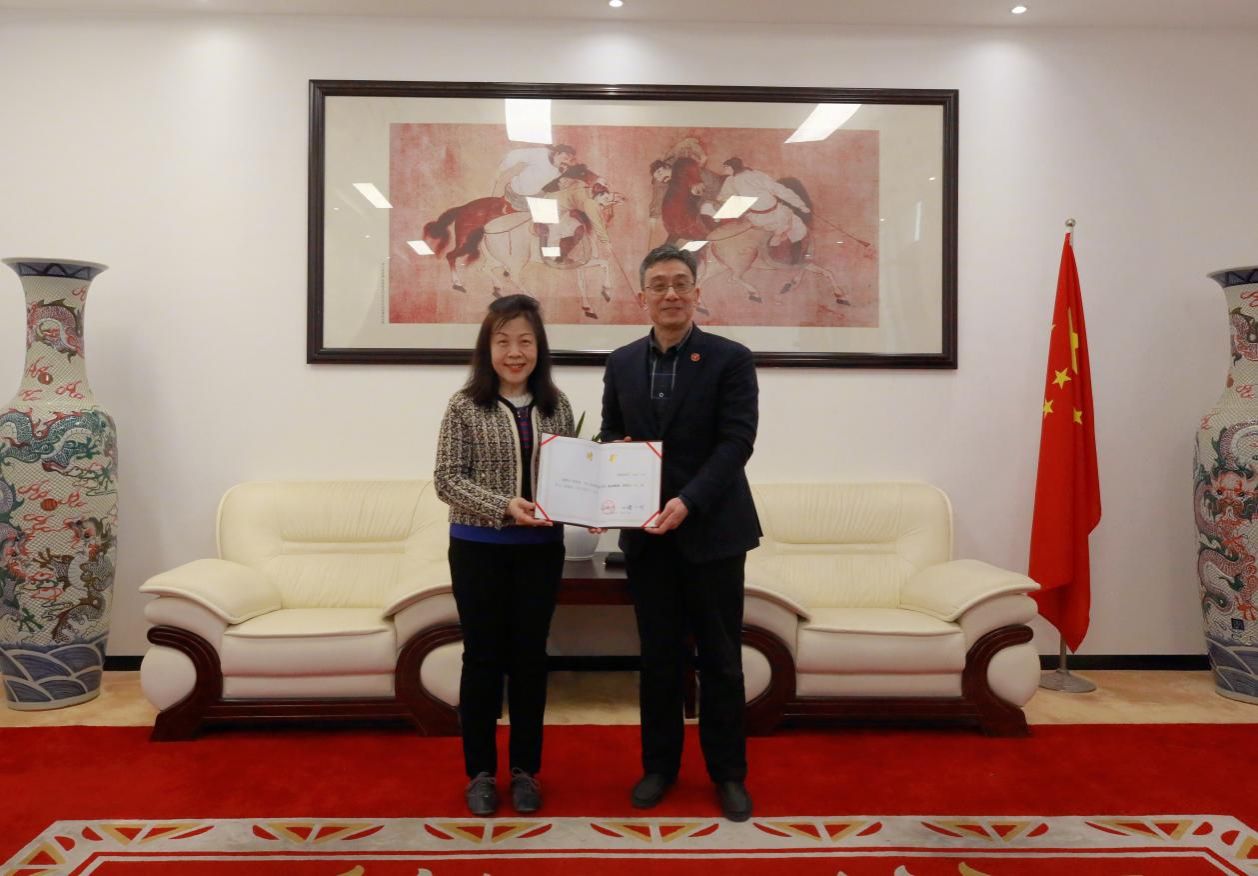 潘小非校长对阮妙芬教授的到来表示欢迎,并介绍了红足1世“体艺并蓄”鲜明办学特色中的思想内涵和艺术类专业办学情况,表示希望阮妙芬教授常来红足1世交流指导,为红足1世艺术类专业建设献言献策,更好的推动学科专业建设发展。随后潘小非校长向阮妙芬教授颁发红足1世官网客座教授聘书。
