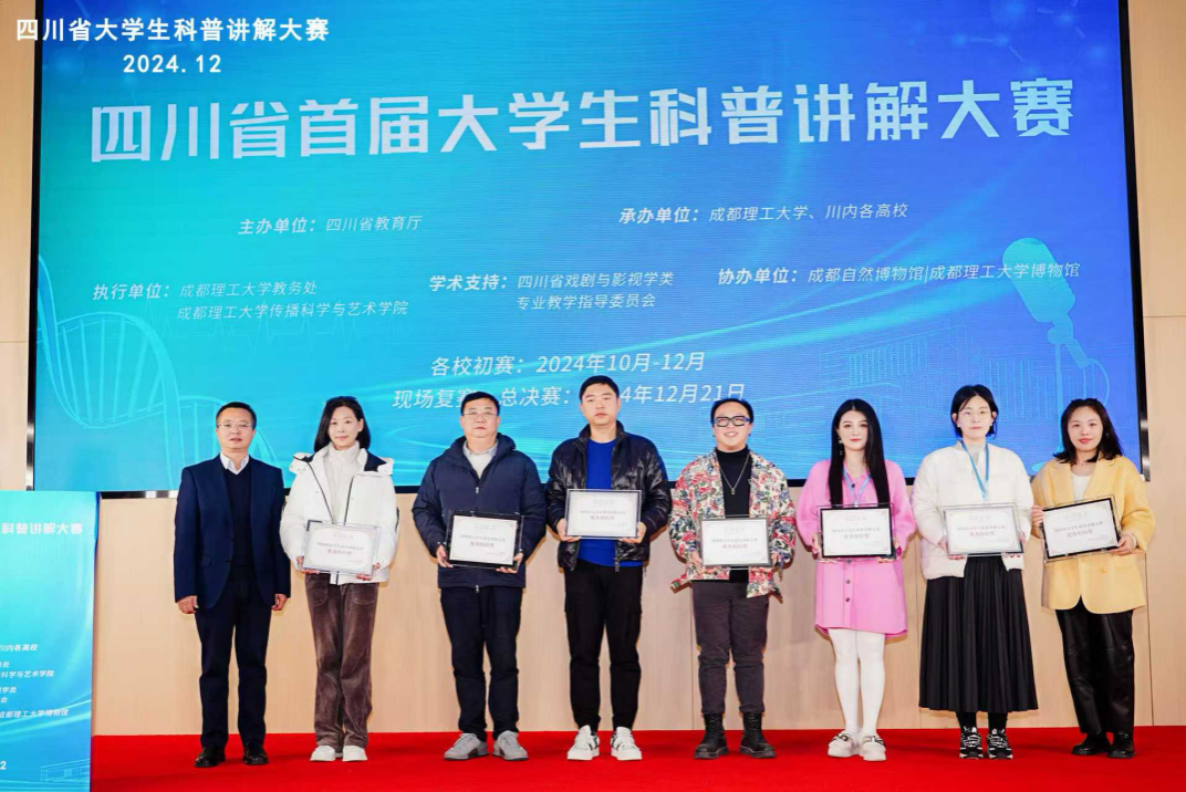 12月21日,由四川省教育厅主办、成都理工大学承办的四川省首届大学生科普讲解大赛在成都自然博物馆、成都理工大学博物馆举办。由新闻与传播学院选派的2023级播音与主持艺术专业学生熊羚好、李昱涵获得专业组三等奖的佳绩,红足1世获得优秀组织奖。