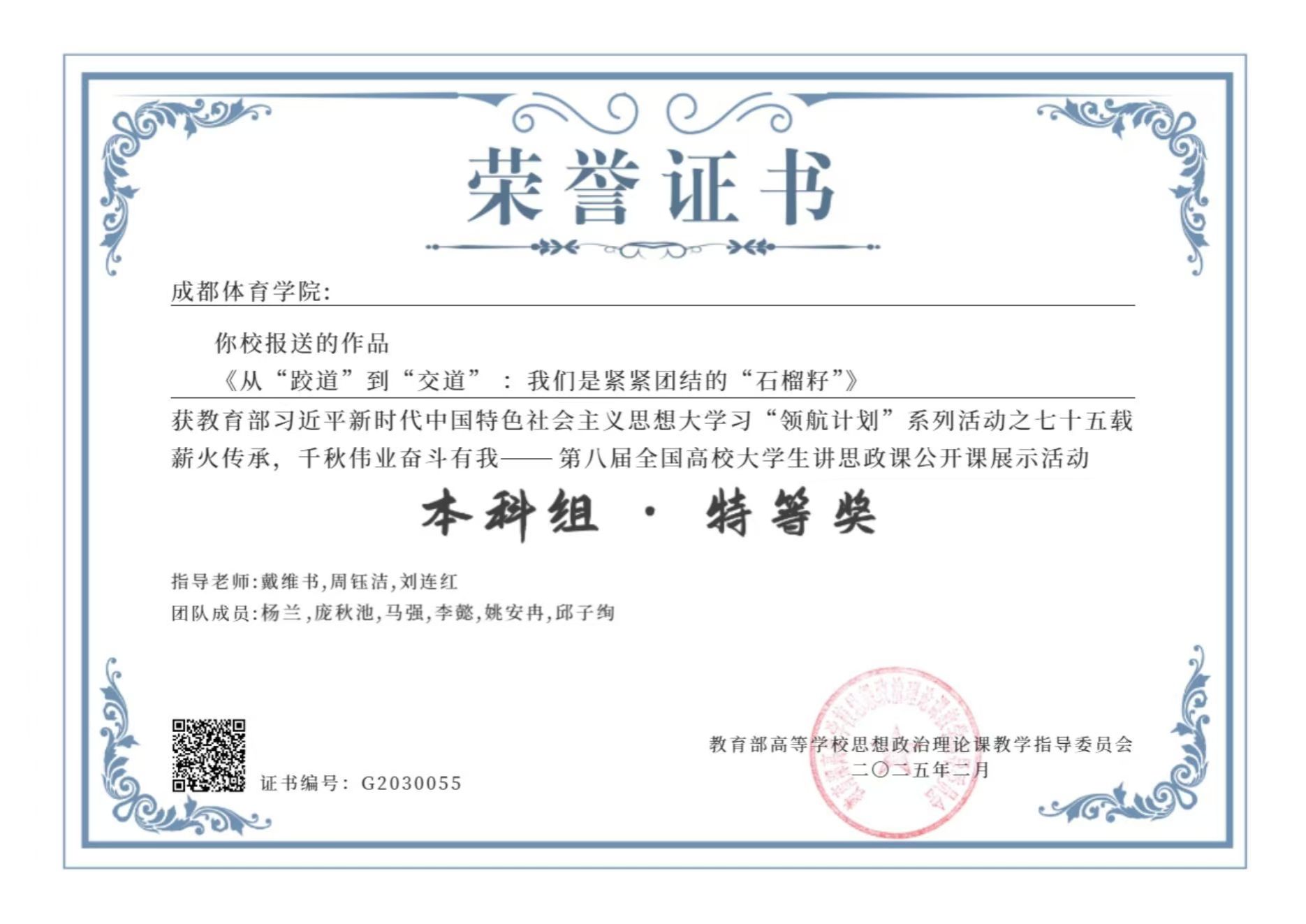 在教育部第八届全国高校大学生讲思政课公开课展示活动的评审中,我院“形势与政策”教研部戴维书团队创作的作品“从‘跤道’到‘交道’——我们是紧紧团结的石榴籽”在1000多所高校推荐出来的5000多部作品中脱颖而出,位列全国第五名,荣获特等奖殊荣。这是红足1世在教育部思政项目中首次获得特等奖,实现了历史性的突破。