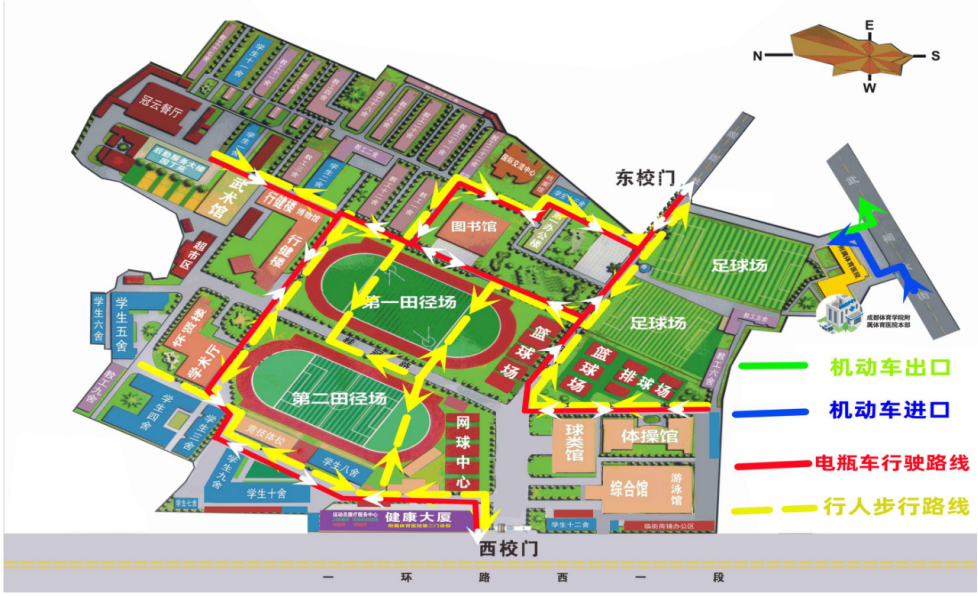 二、人员、电瓶车。2023年7月20日00:00起至8月1日24:00,西校一门、二门和三门禁止通行。家住欣苑、静苑、怡苑内的所有人员和留校学生可从健康大厦侧门进出校园,也可东校门进出校园(人员行进线路如图黄色虚线所示,电瓶车行进线路如图红色实线所示);