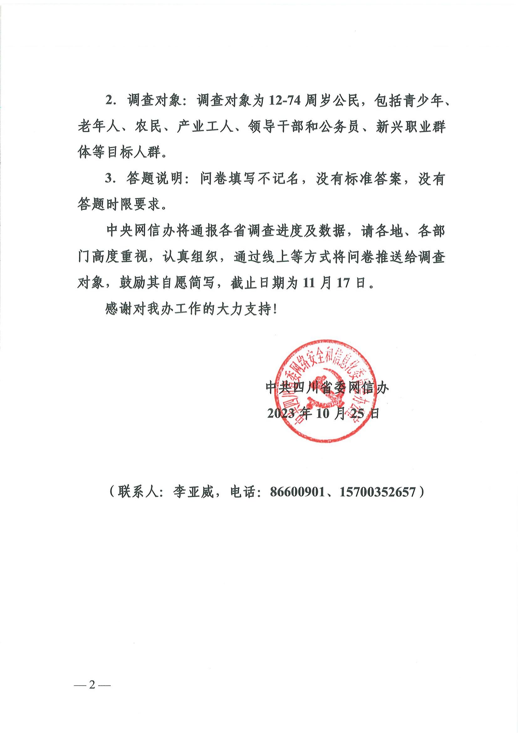 现将中共四川省委网信办《关于请协助开展2023年全民数字素养与技能发展水平调查评估的函》转发你们,请各单位高度重视,认真组织,通过线上等方式将问卷推送给调查对象,鼓励师生自愿填写,截止日期为11月17日。
