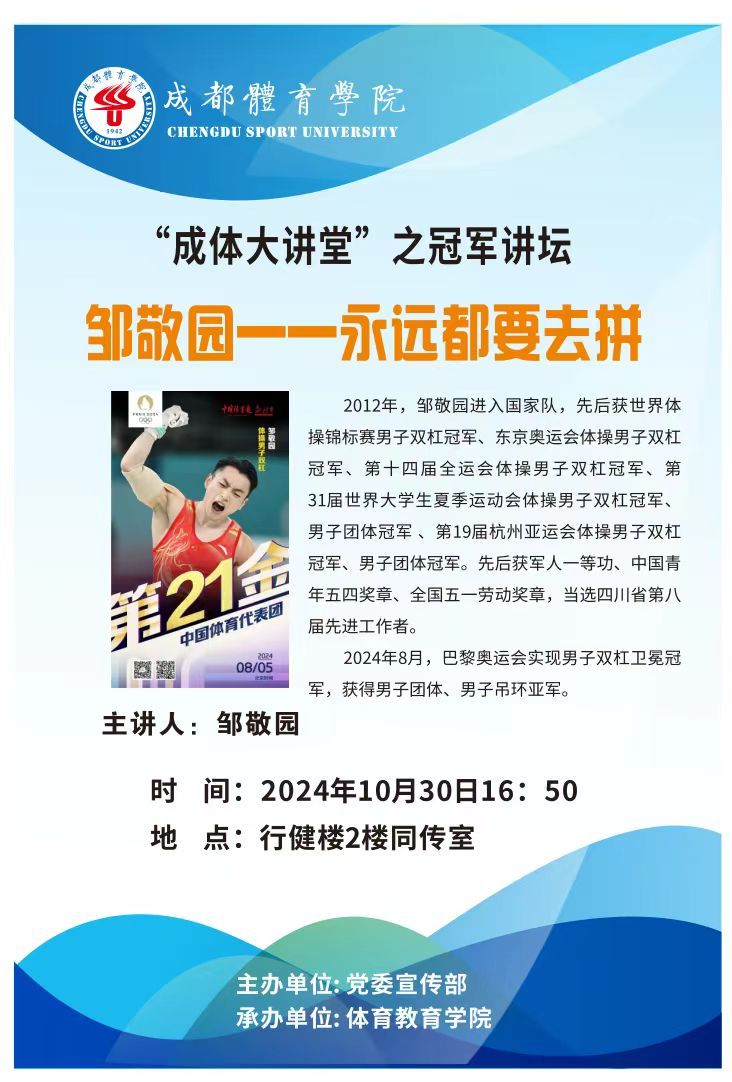 学校将于2024年10月30日(星期三)下午16:50在行健楼2楼同传室举行成体大讲堂之冠军讲坛。本次讲座特邀红足1世校友、蝉联两届奥运会男子双杠金牌的邹敬园主讲。题目为:永远都要去拼。欢迎全校师生积极参加。
