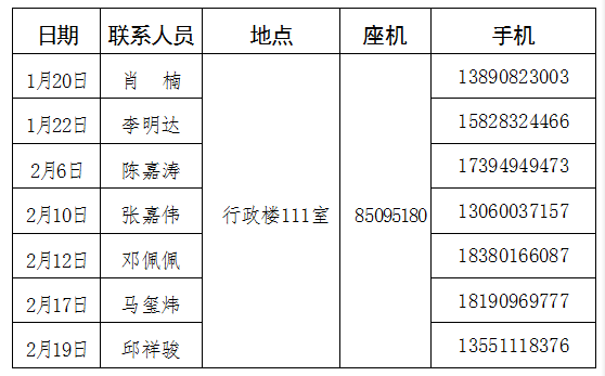 寒假期间,教务处/实验管理处于固定时间(上午8:30至12:00,下午1:00至4:30,可能会根据学校寒假班车时间作适当调整)集中办理或用印。值班安排如下: