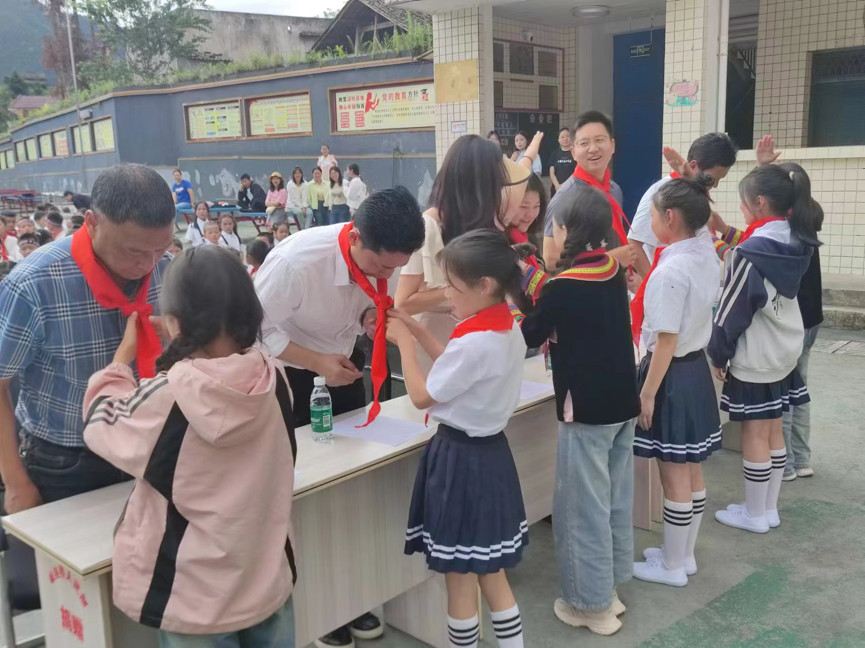 觉莫小学的同学们细心的为教育他们的老师们亲手戴上红领巾,这是对老师崇高的敬意。