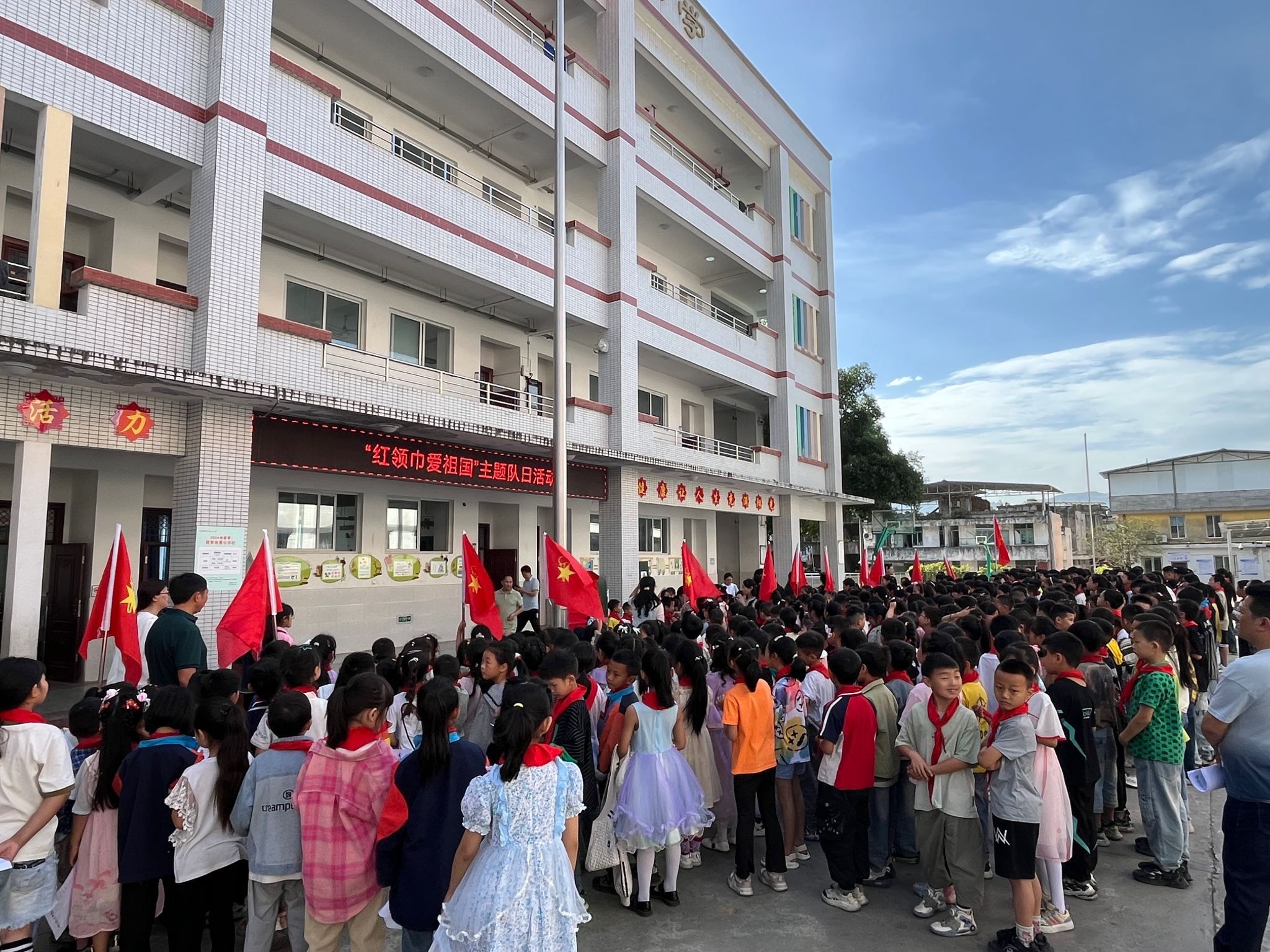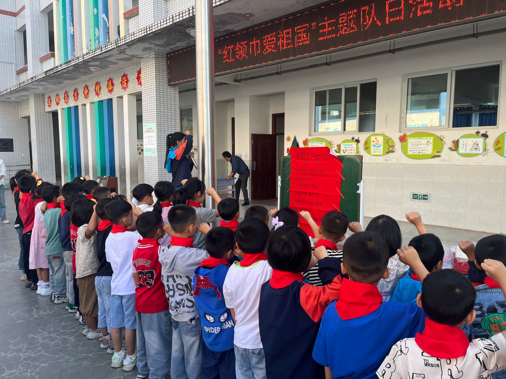 五渡小学的校园广场上“红领巾爱国主题教育”,小朋友们在国旗下庄严的举起小小右拳,进行少年先锋队宣誓,将红色的种子植入孩子们的心中。