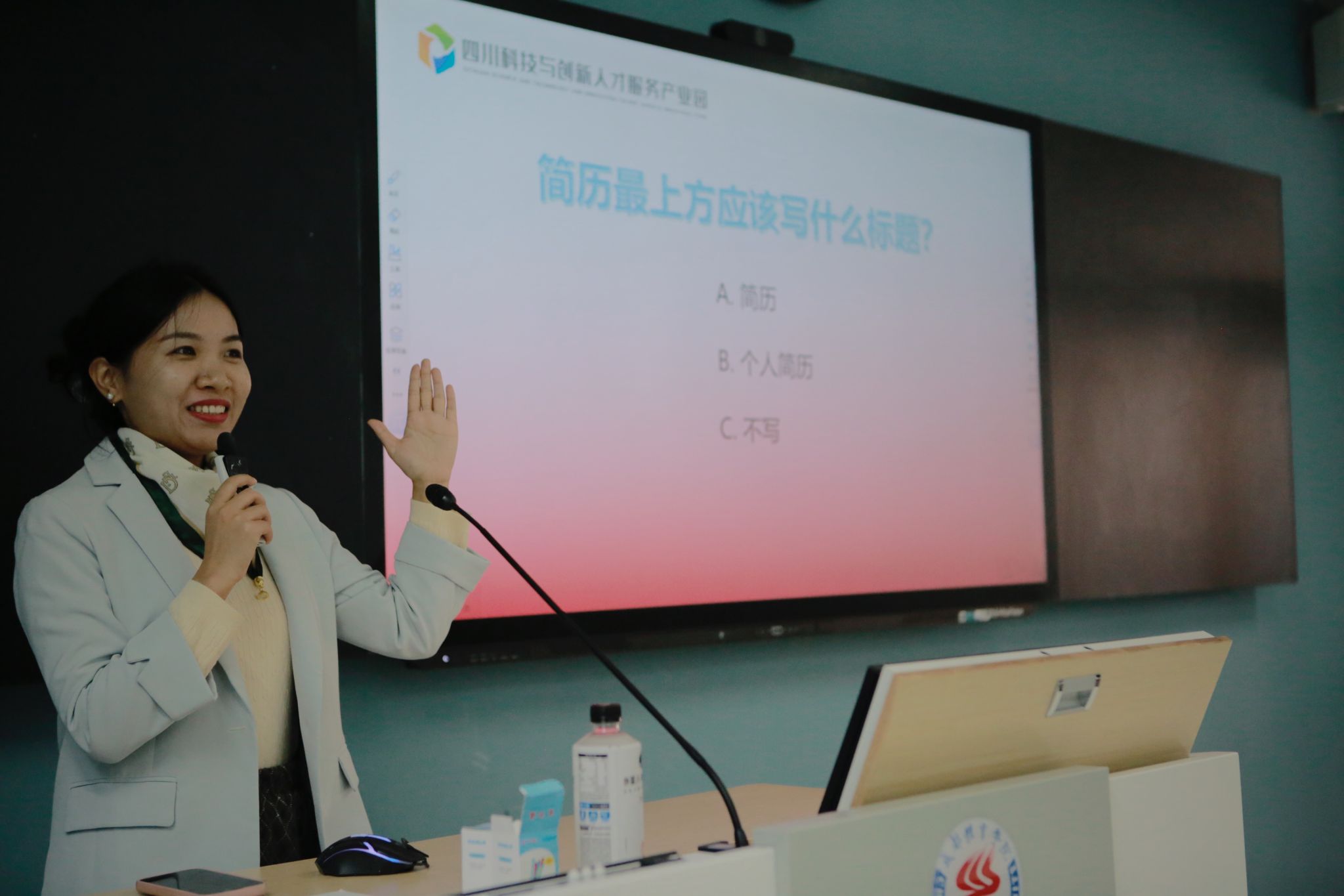 此次活动与四川省科技与创新人才服务产业园合作,邀请到了有着近十年人力资源招聘经验的世界500强外企HR郭小凤老师担任讲师,从简历内容设计、排版美观性、技能和经验展示等多个方面展开详细讲解。郭老师不仅传授了“简历黄金法则”,还结合具体案例展示了成功的简历模板,干货满满,毕业生们纷纷表示实操性强,收获颇丰。