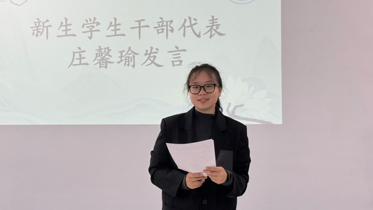 2024级新生干部代表庄馨瑜发言,她号召新加入的同学们共同肩负起学生干部的责任感和使命感,为学生会的成长和学院的发展贡献青春力量。