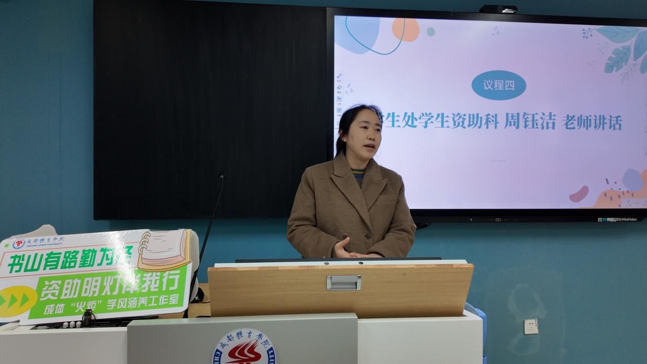 随后,周钰洁老师以“成体温馨助力,资助伴我前行”为主题,向大家解读了最新资助政策及学校资助工作部署安排,让同学们放下后顾之忧,勤学好问,博学笃行,以资助为契机、让育人有成效。“种”一粒种子,“生”向阳之花。