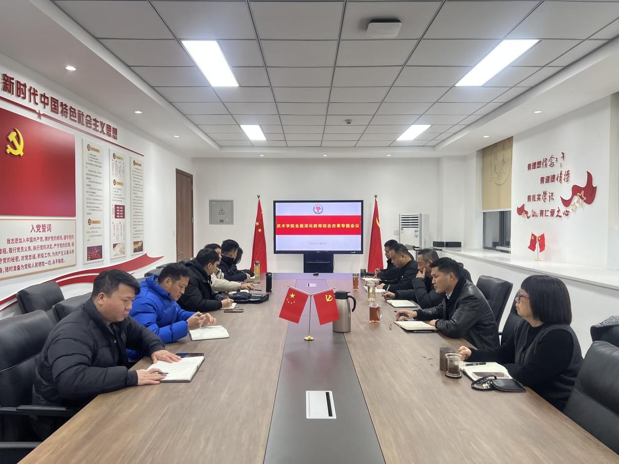 12月23日上午,武术学院在武术馆会议室召开全面深化教育综合改革专题会议。武术学院院长赵斌、学院党委书记罗兴山、副院长李传国,学院党委办公室、本科生管理办公室、研究生管理办公室、各教研室主要负责人参加会议。会议由罗兴山书记主持。