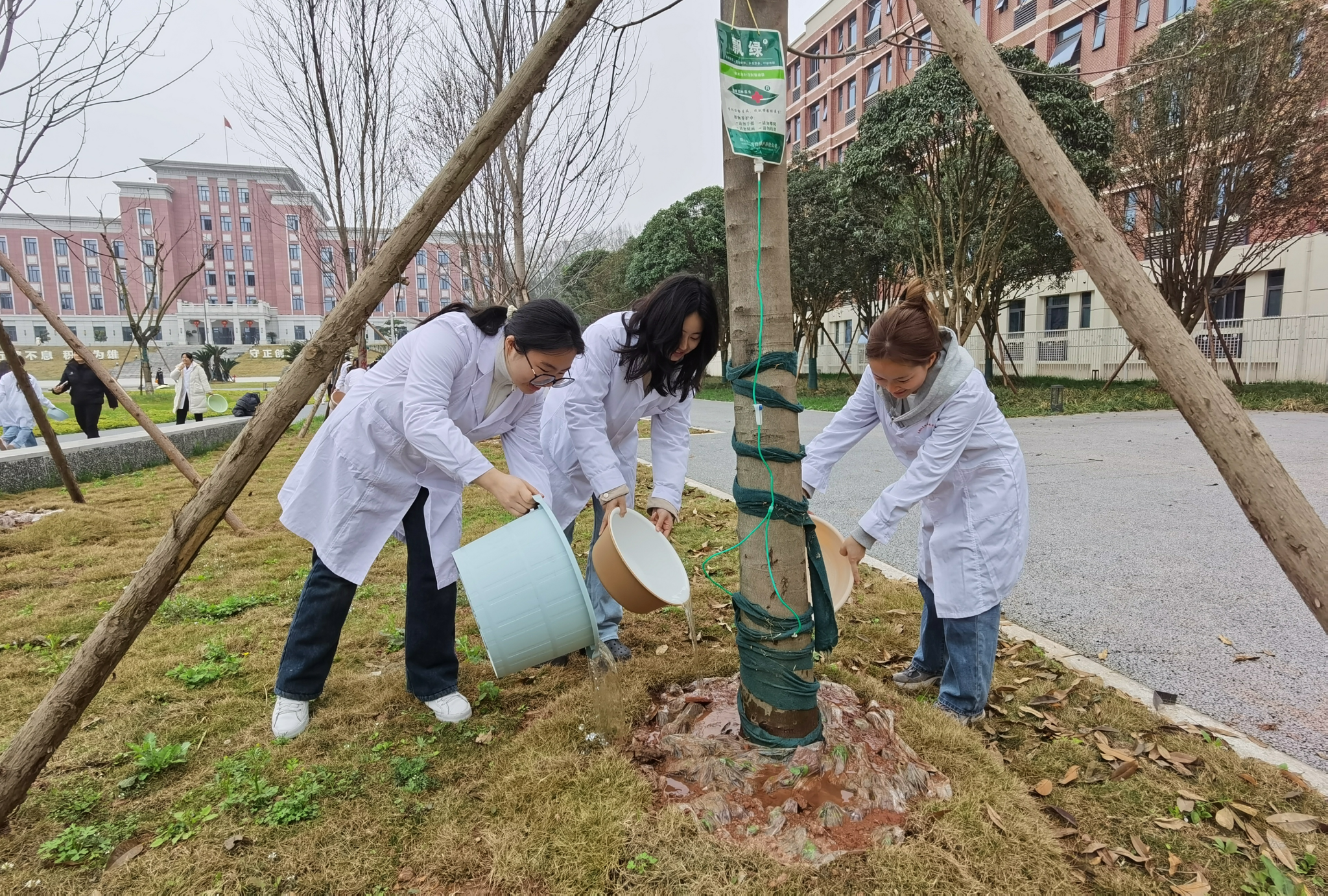 运动休闲学院团总支、学生会:手提水桶、肩扛水管,让每一滴水都能被树苗充分吸收。